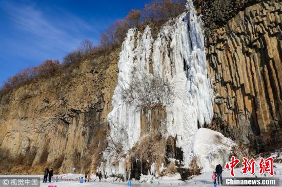 因为火山群分布区的玄武岩台地和火山锥附近,分布着较多的玄武岩孔洞裂隙泉水,在冬季,泉水自上而下流经玄武岩柱林,在严寒的冻结下,逐渐形成了垂直而立的巨大冰瀑。(图片来源:视觉中国)